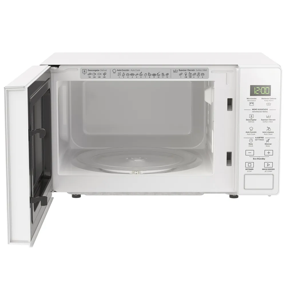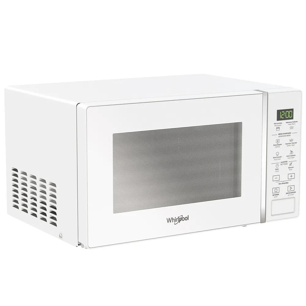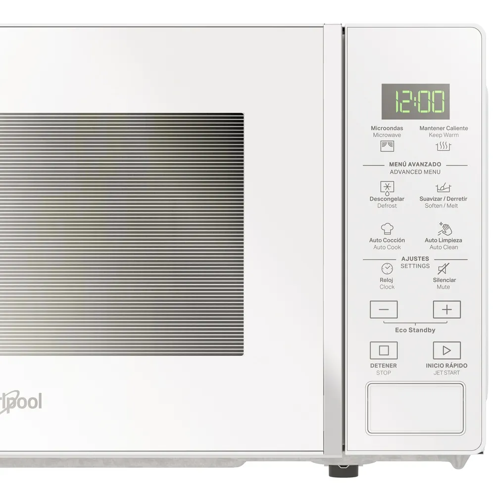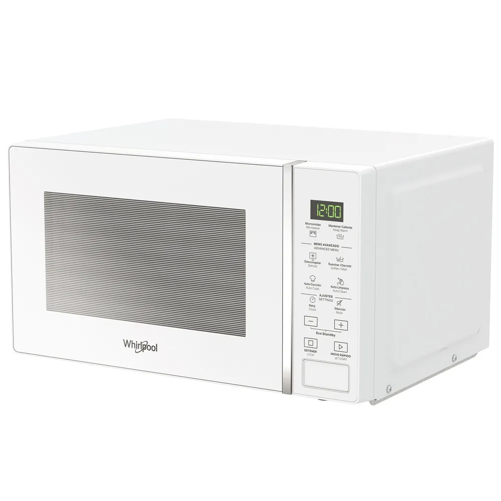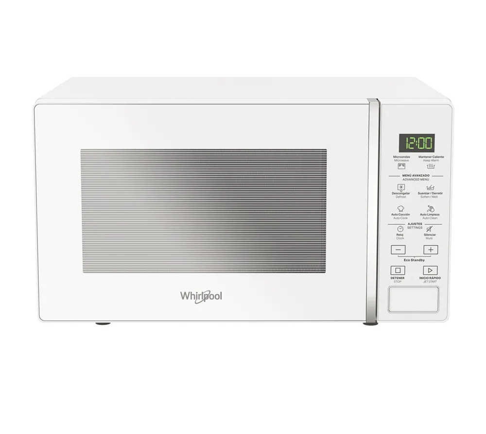 Microondas Whirlpool WMS20BZIM UPB. Diseño moderno con frente de espejo y terminaciones blancas que se integran fácilmente a cualquier cocina. Capacidad de 20 litros, ideal para uso diario. Panel digital con funciones automáticas que simplifican la cocción. Opción Auto Cook con recetas preestablecidas que ajustan automáticamente el tiempo y la potencia. Función Auto Clean que facilita la limpieza interna con solo presionar un botón. Keep Warm mantiene los platos calientes hasta el momento de servir. Incluye modo Descongelar, Suavizar/Derretir, Inicio rápido y Bloqueo de seguridad para mayor protección. También cuenta con Modo Silencio para un uso más cómodo y discreto. Dimensiones: 45,2 x 26,2 x 35,0 cm (Ancho x Alto x Profundidad). Potencia eficiente para calentar, cocinar y descongelar con resultados uniformes.