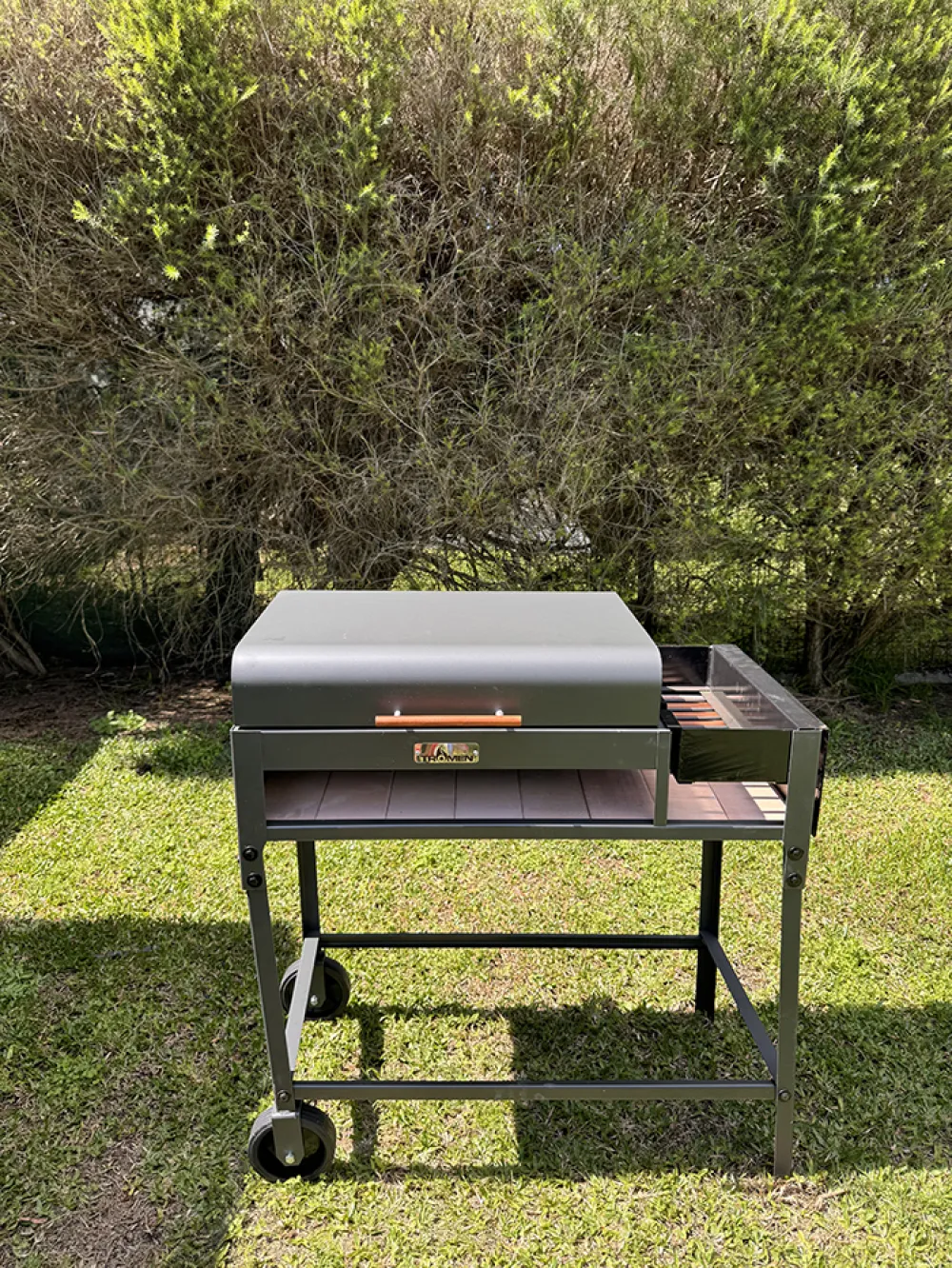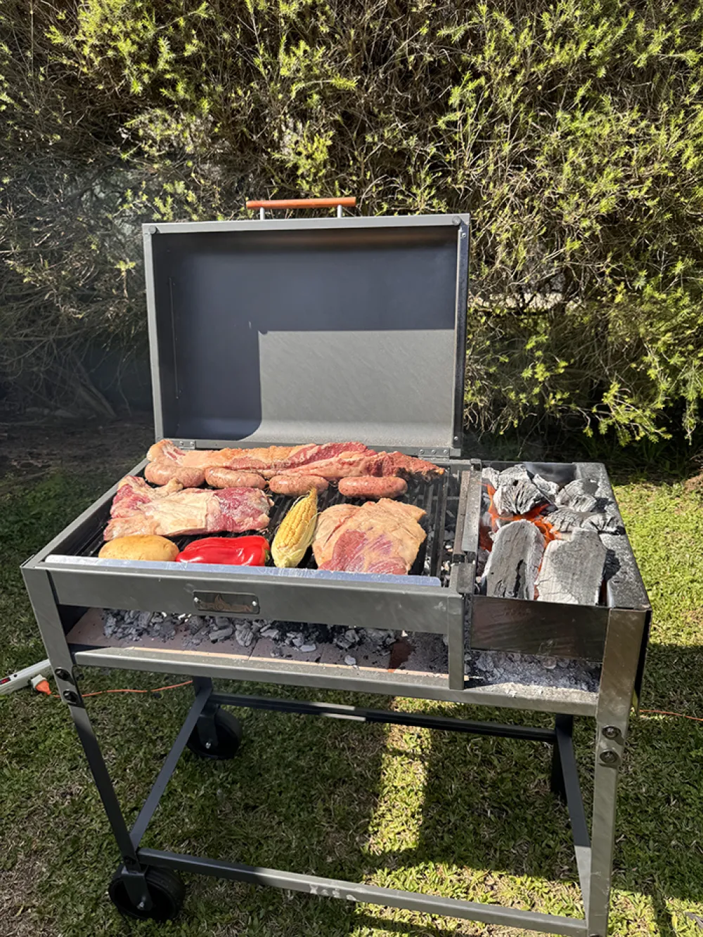 3 módulos parrilla, 1 fogonero enlozado, 16 ladrillos refractarios, 1 base con ruedas para ensamblar, 1 tapa para cocción envolvene.